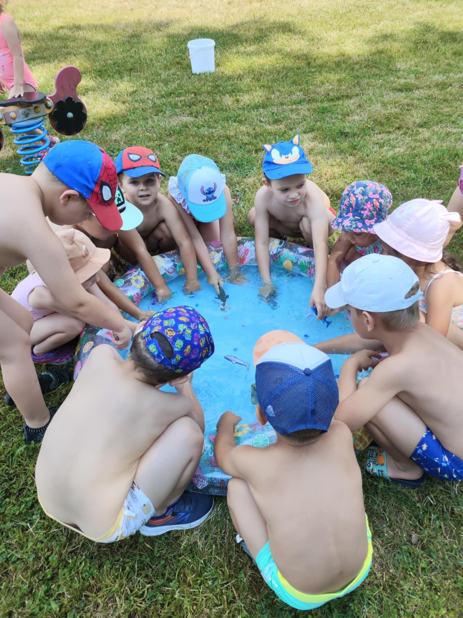 Další den je čekalo smyslohraní – aktivita zaměřená na rozvoj smyslů, motoriky a spolupráce. Děti pomocí netradičních nástrojů, jako jsou pinzety, lžíce nebo naběračky, lovily kamínky z vody, přenášely vodu hrnečky, zkoumaly strukturu hydrogelových kuliček a seznamovaly se s různými mořskými živočichy. Práce v menších skupinkách podpořila komunikaci, rozvoj jemné i hrubé motoriky a nabídla dětem nové poznatky o životě pod mořskou hladinou.