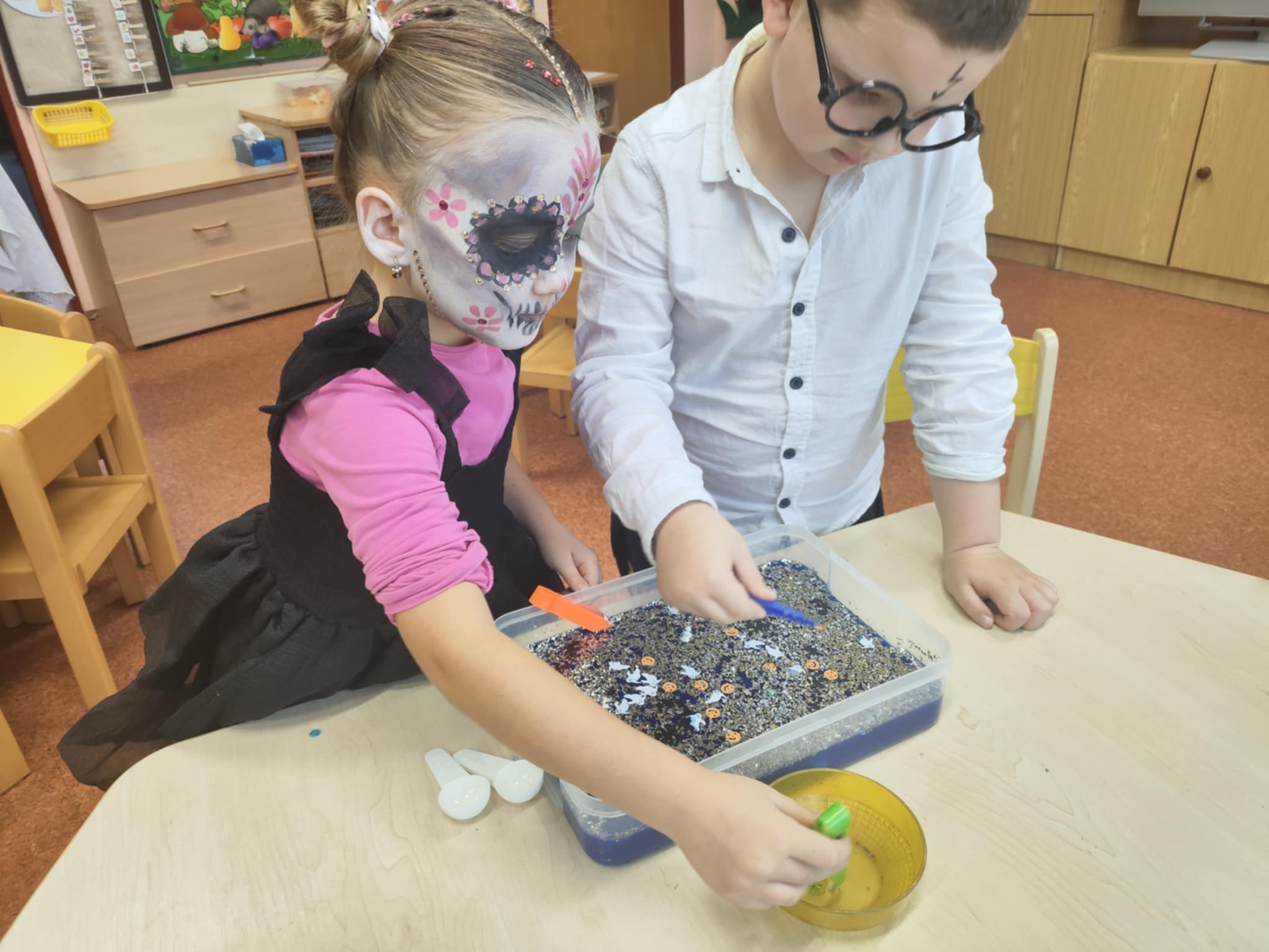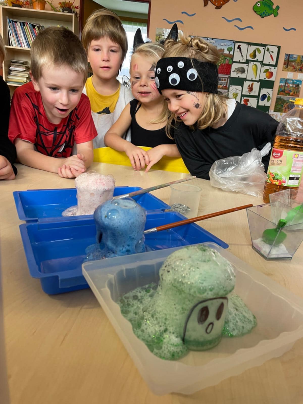 Program těchto dnů byl pestrý a plný zábavy. Děti si vyzkoušely smyslohraní, při kterém například počítaly pavoučí nožičky, lovily z vody strašidelné předměty, nebo za pomoci pinzet tvořily lektvary. Největší „wau efekt“ ale přišel ve chvíli, kdy si mohly vyrobit opravdový bublající lektvar – s použitím barviva, octu a jedlé sody. Děti nadšeně sledovaly, jak se jejich kouzelný nápoj vaří a pění jako v pohádkách.