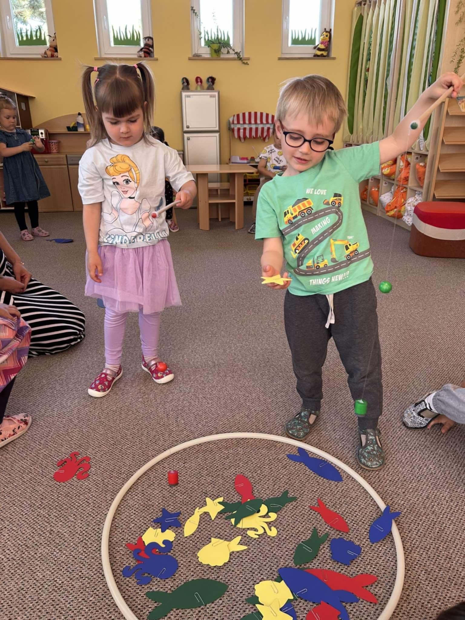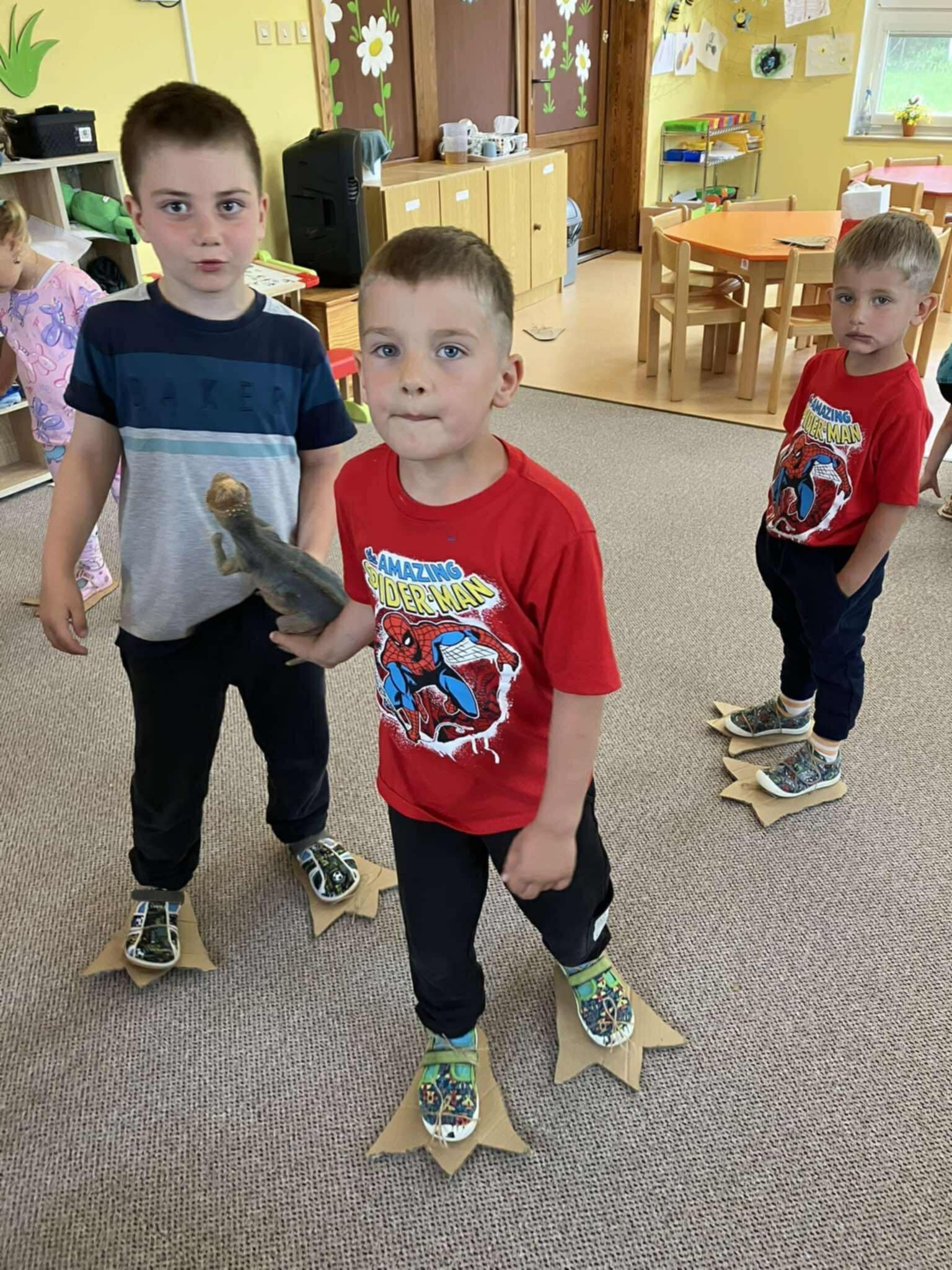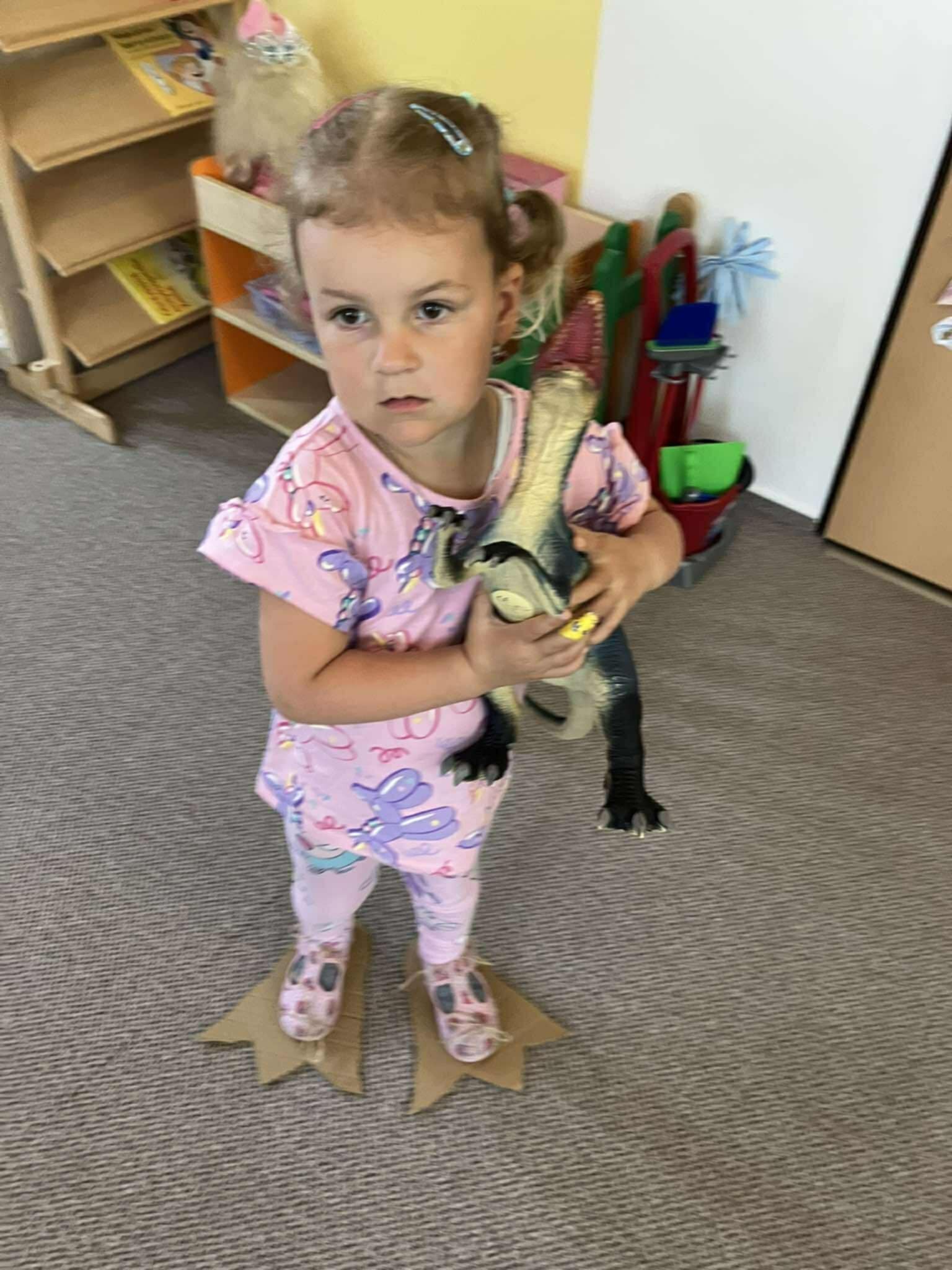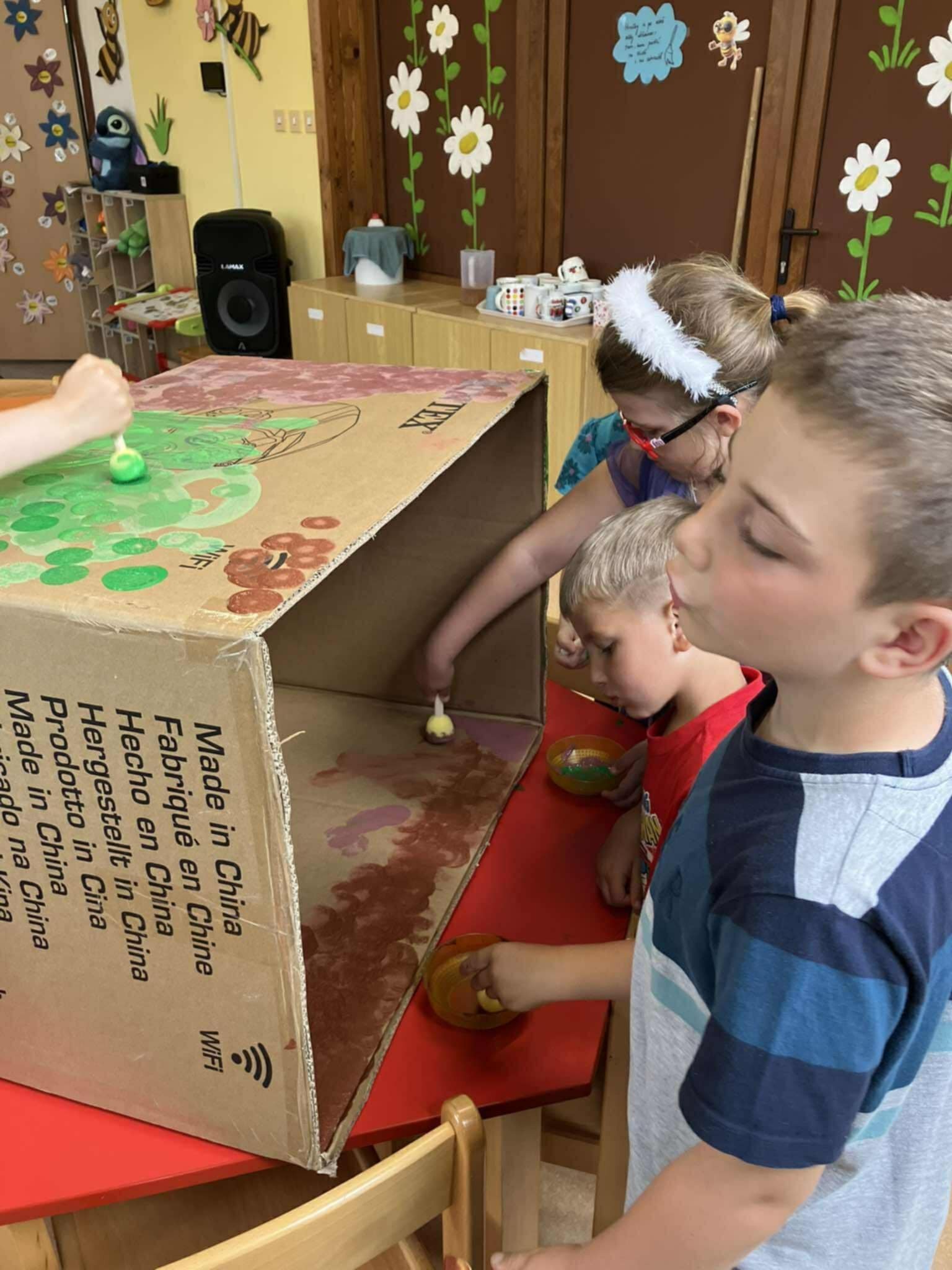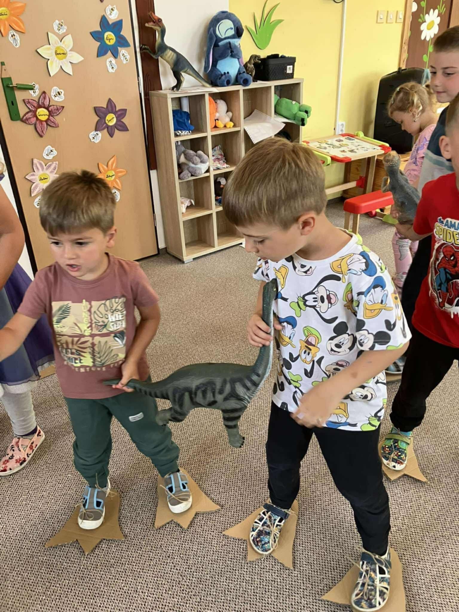 Na vlastní kůži si vyzkoušely, jaké to je být dinosaurem – chodily v obřích dinosauřích tlapách a stavěly si svou jeskyni z krabic a přírodnin, které společně nasbíraly během pobytu venku. V jeskyni se schovávaly, hrály si a rozvíjely svou fantazii i spolupráci.